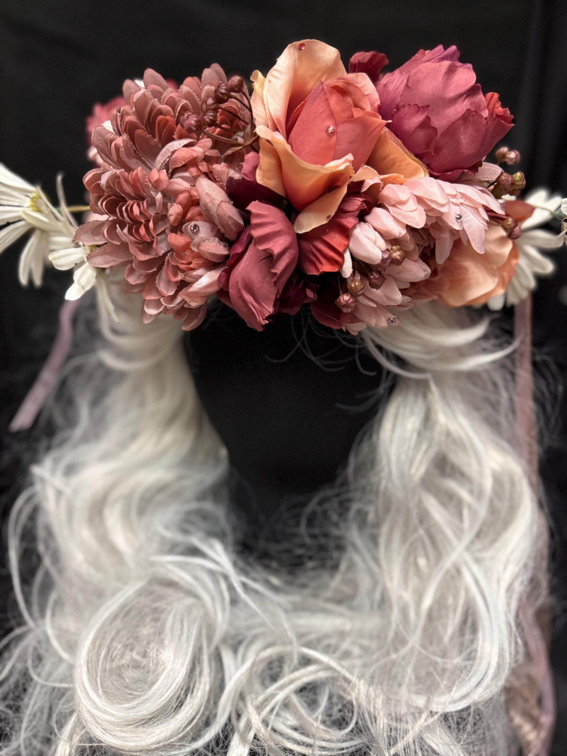 Head Garland: Full and lush, this piece crowns your look with drama. Wear it as a crown, headband, or hat hand - each bloom artfully layered for maximum impact.