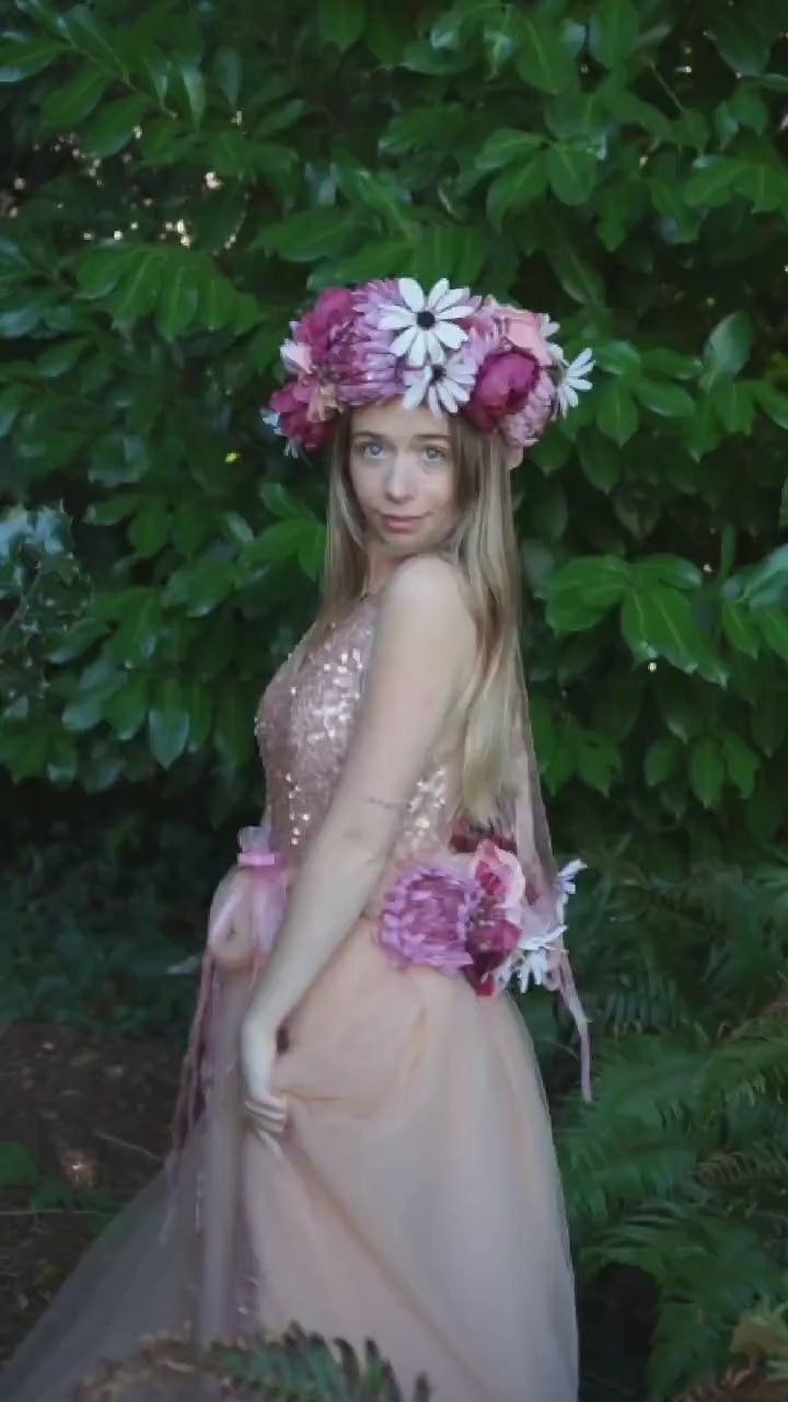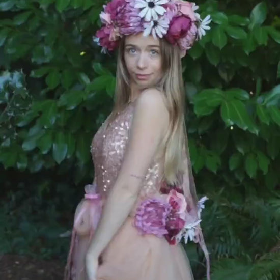 Wear this gown and garlands as a luminous formal ensemble - a muse of softness, beauty, and enchantment.