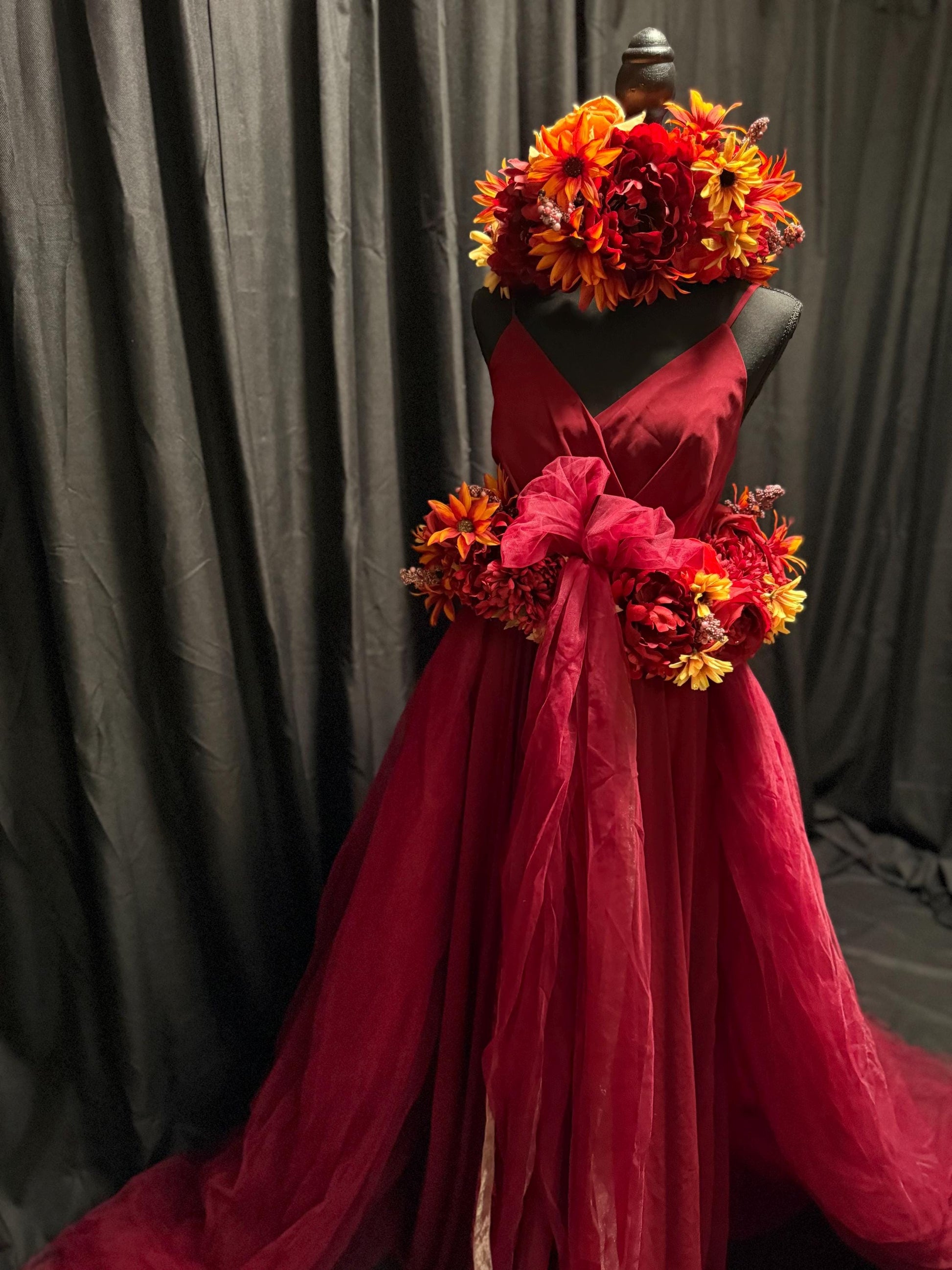 Coordinating Gown: Designed to harmonize with your florals, the gown completes the set, making it perfect for a fully ethereal ensemble with a dramatic and romantic vibe. Each gown is ethically up-cycled / sourced from bridal consignment - giving these lightly worn / previously owned treasures a second life - reimagined as part of your beautifully magical story.