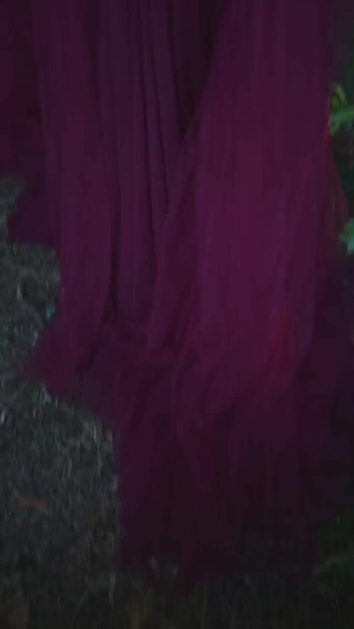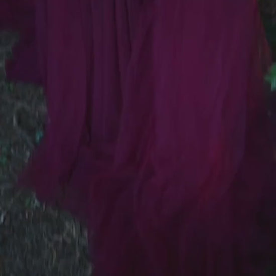 The coordinating pieces include a dramatic head garland, a hip garland that drapes with effortless grace, and a flowing wine-colored gown with a plunging neckline and delicate straps. A trailing tulle train shimmers with fantasy and movement, catching the light with every step.